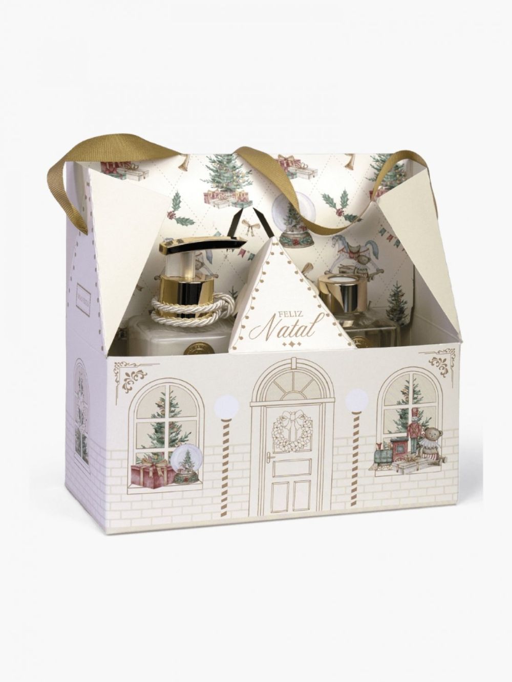 A embalagem em formato de casa com alça traz um toque lúdico e elegante para este presente especial. Dentro, um difusor de ambiente em vidro alto e um sabonete líquido em vidro alto compõem um duo sofisticado que perfuma e embeleza qualquer espaço.